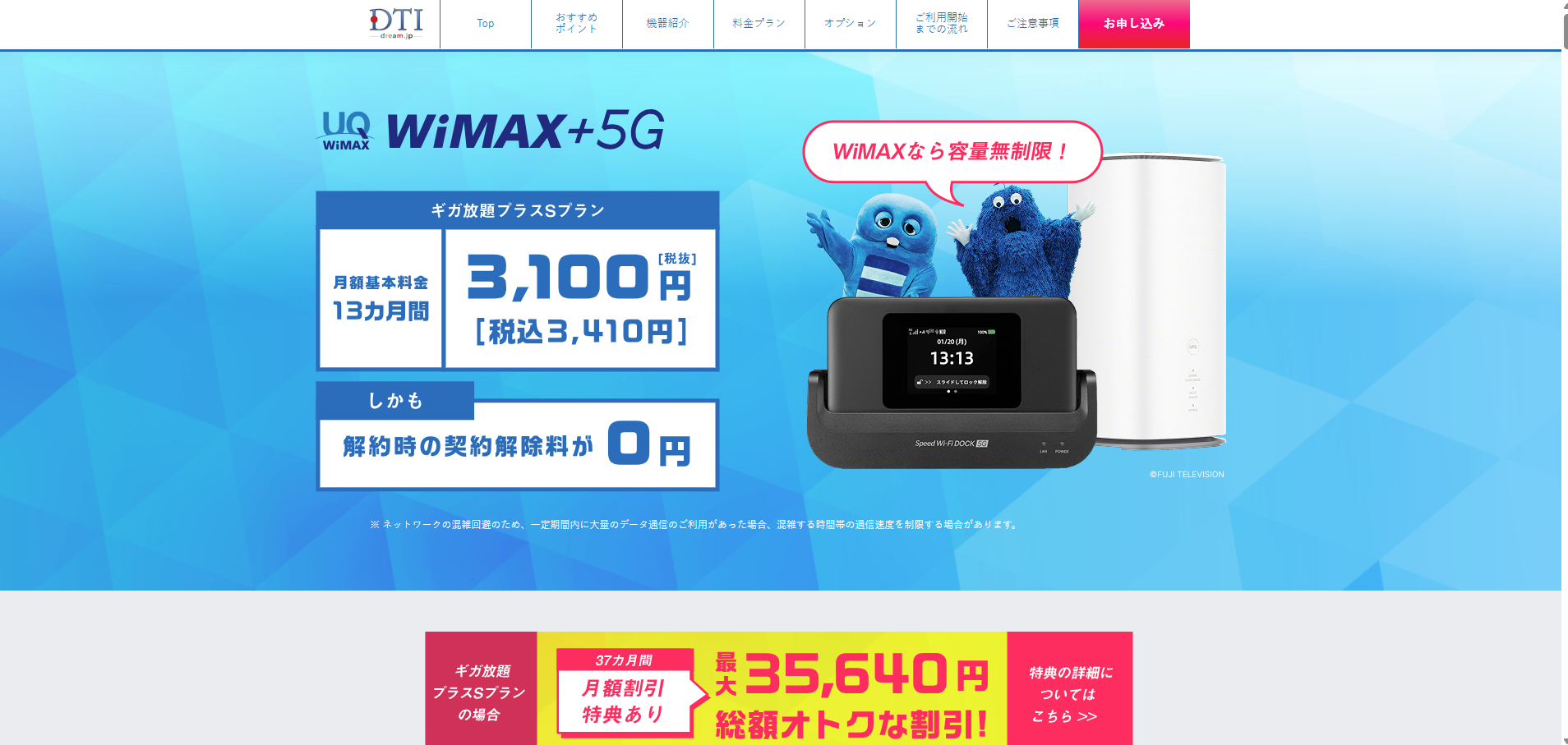 DTI WiMAX 2+ のおすすめポイント 1、家でも外でも手軽にインターネット 2、WiMAX +5G対応の高速通信※ 3、お手ごろサイズのモバイルWi-Fi端末 4、工事・配線不要のカンタン設定 5、おトクな料金で、通信費を節約 ※ 5Gは一部エリアで提供。詳しくはサービスエリアマップでご確認ください。 ギガ放題プラスSプランなら「37カ月間割引特典」でおトク! ギガ放題プラスSプランにご契約いただくと、以下の割引が適用され、おトクな月額でWiMAXをご利用いただけます。 =最大合計 ...