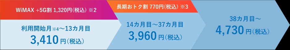 - ※2 1カ月目~13カ月目までは「WiMAX +5G割」が適用され、1,320円(税込)の割引が入ります。